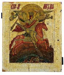 Keywords: Icon of saint Michael horseman (Russia, 19th c., priv. coll.).jpg St Michael Horseman of the Ap St Michael Horseman of the Apocalypse Egg tempera on wood panel with kovcheg Crowned with prominent outstretched wings astride a fiery winged horse the archangel blowing a golden trumpet raising a Book of Gospels and plunging his lance into the mouth of the Devil Christ Emmanuel appearing in swirling clouds in the left corners Rendered with saturated red and red colours complemented by gold details The background and the border stripped to gesso Russian 19th century 30 5 x 26 cm Russland 19 Jh http //www auctions-fischer de/catalogues/online-catalogues/207-i-russian-greek-icons html L 1 kategorie 93 artikel 24620 L 1 cHash 9ae84664fd century 19 anonymous Private collections of Russian art Files uploaded by Shakko from various sources PD-Art 19th-century icons of Russia Icons of Saint Michael horseman |