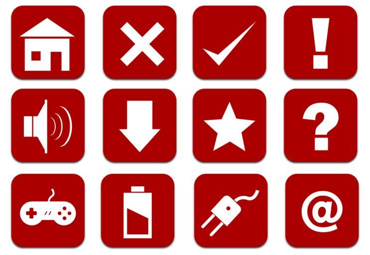 Keywords: icons set red home cancel check attention warning download speaker volume favorite star help question games battery power energy email plug delete remove gui