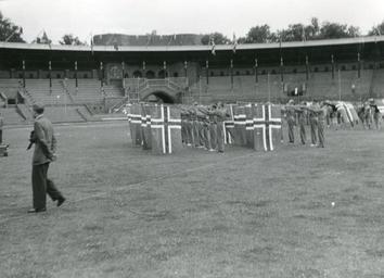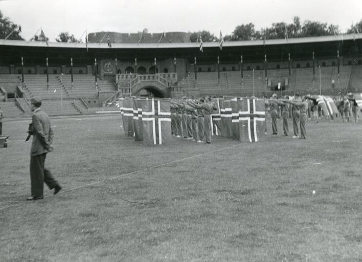 Keywords: idrett andre verdenskrig andreverdenskrig nordmenn i sverige under krigen nordmennisverigeunderkrigen 2. verdenskrig 2verdenskrig sport okkupasjonstiden outdoor blackandwhite black and white 3. august 1943 ble det i stadion i Stockholm arrangert et stort idrettsstevne for nordmenn med finalen i kampen om krigsmesterskapet. Bildet er tatt under defileringen. RA/PA-1209/Uc/71/3/S339A 3. august 1943 ble det i stadion i Stockholm arrangert et stort idrettsstevne for nordmenn med finalen i kampen om krigsmesterskapet. Bildet er tatt under defileringen. RA/PA-1209/Uc/71/3/S339A |