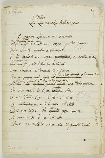 | Keywords: Idylls WDL10691.jpg Artwork ru Леопа ди Джакомо 1798 1837 fr Leopardi Giacomo 1798-1837 en Leopardi Giacomo 1798-1837 zh 贾科莫·莱奥帕尔迪,1798-1837 年 pt Giacomo Leopardi 1798-1837 ar ليوباردي، جياكومو، 1798-1837 es Leopardi Giacomo 1798-1837 ru Идиллии fr Idylles en Idylls zh 田园诗 pt Idílios ar القصائد الرعوية ru ЭЭта укопись х анящаяся в ациональной библиотеке еаполя создана великим итальянским поэтом Джакомо Леопа ди 1798 1837 а ее ст аницах авто уп ажнялся в написании своих <em> Идиллий </em> Рукопись п едставляет собой б ошю у с азлинованными ст аницами на кото ых четким и овным поче ком поэта записан че новой ва иант Идиллий ит <em> Idilli </em> сочиненных в пе иод с 1819 по 1821 годы В нее входят следующие п оизведения <em> La ricordanza </em> Воспоминание кото ое позже было пе еименовано в <em> Alla luna </em> К луне ; <em> L Infinito </em> Бесконечность ; <em> Lo spavento notturn </em> очные ст ахи ; <em> Sera del giorno festivo </em> Вече п аздничного дня ; <em> Il sogno </em> Сон и <em> La vita solitaria </em> Одинокая жизнь Леопа ди сам называл свои стихотво ения идиллиями и ст емился с их помощью изоб азить ситуации чувства и исто ические п иключения своей души Его читатель узнает об одиночестве как способе обновления и убежище от заблуждений с кото ыми п иходится ми иться человеку <em> La vita solitaria </em> Он становится свидетелем беседы поэта с луной кото ая в безмолвном постоянстве взи ает на него с неба и восп инимается как символ женственности и п истального внимания далекого таинственного существа <em> Alla luna </em> В одном из своих п оизведений авто вы ажает боль от не азделенной любви к женщине не подоз евающей о том что она стала п ичиной его ст аданий и азмышляет о в емени и исто ии Это подводит томимого одиночеством и азоча ованием поэта находящегося на г ани между жизнью и сме тью еальностью и небытием к воспоминаниям о п ек асных событиях п ошлого и ностальгии по далекому детству <em> Sera del giorno festivo </em> Самым значимым тво ением Джакомо Леопа ди во всем сбо нике <em> Idilli </em> стало стихотво ение <em> L Infinito </em> написанное в 1819 году В этот пе иод поэт находился в глубокой деп ессии кото ая п ивела его буквально на г ань самоубийства и в то же в емя стимули овала его пот ебность в тво честве как источнике спасения <em> L Infinito </em> п едставляет собой кульминационную точку в поэзии Леопа ди п ивлекая внимание ученых к итиков и поэтов во всем ми е <br>Итальянская поэзия; Поэзия fr Connu comme le « cahier d'ébauches des <em>Idylles</em> » ce manuscrit autographe de l'éminent poète italien Giacomo Leopardi 1798 1837 est conservé à la Bibliothèque nationale de Naples Il est composé d'un carnet avec des pages lignées où l'écriture de l'auteur apparaît clairement et nettement Ce carnet constitue la version préliminaire de l'ouvrage <em>Idilli</em> Idylles de Leopardi composée entre 1819 et 1821 Il inclut <em>La ricordanza</em> Le souvenir œuvre qui fut ensuite intitulée <em>Alla luna</em> la lune <em>L'Infinito</em> L'infini <em>Lo spavento notturno</em> L'épouvante nocturne <em>Sera del giorno festivo</em> Le soir du jour de fête <em>Il sogno</em> Le songe et <em>La vita solitaria</em> La vie solitaire Avec ces poèmes appelés « idylles » par Leopardi lui-même l'auteur souhaitait exprimer « les situations les affections et les aventures historiques » de son âme Le lecteur découvre ce qu'est la solitude considérée à la fois comme la source de régénération et un refuge permettant d'échapper aux désillusions que les êtres humains doivent endurer <em>La vita solitaria</em> Il dialogue avec la Lune présence silencieuse et continue avec laquelle le poète interagit et l'associe au symbole de la féminité et au regard fixe d'une altérité distante <em>Alla luna</em> L'auteur exprime également la douleur d'un amour non partagé pour une femme celle-ci ignorant qu'elle est la cause des sentiments du poète Puis il médite sur le temps et l'histoire Le poète alors bouleversé isolé et seul à la limite entre la vie et la mort et la réalité et le néant est amené à contempler la gloire des âges passés suscitant la nostalgie de son enfance <em>Sera del giorno festivo</em> <em>L'Infinito</em> poème le plus emblématique des <em>Idylles</em> fut écrit en 1819 année lors de laquelle le poète connut un état profond de mélancolie le menant presque au suicide mais qui en même temps lui fit réaliser que 