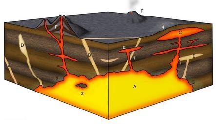 | Keywords: Igneous structures.jpg en Schematic overview of plutonic subvolcanic and volcanic structures/rock bodies and accompanied processes and phenomena Structures A active magma chamber called pluton when cooled and entirely crystallized; a batholith is a large rock body composed of several plutonic intrusions B old magmatic dykes/dikes C emerging laccolith D old pegmatite late-magmatic dyke formed by aggressive and highly mobile residual melts of a magma chamber E old and emerging magmatic sills F stratovolcano Accompanied processes and phenomena 1 young emerging subvolcanic intrusion cutting through older one 2 xenolith solid rock of high melting temperature which has been transported within the magma from deep below or roof pendant fragment of the roof of the magma chamber that has detached from the roof and sunk into the melt 3 contact metamorphism in the country rock adjacent to the magma chamber caused by the heat of the magma 4 uplift at the surface due to laccolith emplacement in the near subground de Schematische à bersicht plutonischer subvulkanischer und vulkanischer Strukturen/Gesteinskörper und begleitender Prozesse und Erscheinungen Strukturen A aktive Magmakammer als Pluton bezeichnet wenn abgekühlt und komplett auskristallisiert; ein sehr großer komplex aufgebauter Pluton wird auch Batholith genannt B alte magmatische Gänge C entstehender Lakkolith D alter Pegmatitgang spätmagmatische Bildung aggressiver und hochmobiler Restschmelzen eines Plutons E alte und entstehende magmatische Lagergänge F Schichtvulkan Begleitende Prozesse und Erscheinungen 1 junge entstehende subvulkanische Intrusion durchschneidet/kreuzt eine ältere 2 Xenolith festes Gestein mit hohem Schmezpunkt das innerhalb des Magmas aus großer Tiefe transportiert wurde oder Pendant des Daches der Magakammer Fragment des Daches der Magmakammer das sich abgelöst hat und in das Magma eingesunken ist; man beachte dass das Dach der Magmakammer aus Nebengestein besteht während der sogenannte Dachbereich des abgekühlten Plutons den obersten Teil des eigentlichen magmatischen Gesteinskörpers bezeichnet 3 Kontaktmetamorphose im unmittelbar an die Magmakammer angrenzenden Nebengestein ausgelöst durch die Wärme des Magmas 4 Hebungsvorgang an der Erdoberfläche infolge der Platznahme eines Lakkolithes im nahen Untergrund own 2007-03 user Woudloper Please report to me when errors or inconsistencies are found Volcanological diagrams Block diagrams cartography Igneous rocks Magmatic systems |