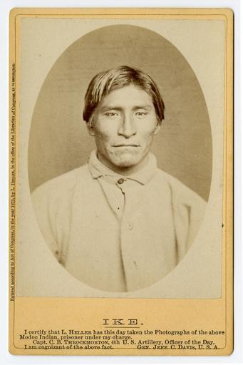 | Keywords: people photo border Repository: California Historical Society Collection: Photographic portraits of Modoc Indians of the Modoc War Photographer: Heller, Louis Herman Date: 1873 General note: Printed on mounts: I certify that L. Heller has this day taken the photographs of the above Modoc Indian prisoner under my charge. Capt. C.B. Throckmorton, 4th U.S. Artillery, Officer of the Day. I am cognizant of the above fact. Gen. Jeff. C. Davis, U.S.A. General note: Photos were published by Carleton E. Watkins. Watkins' Yosemite Art Gallery advertisement on verso. Format: Carte de visite Call Number: PC 006 Digital object ID: PC 006_14.jpg Preferred citation: Ike, Photographic portraits of Modoc Indians of the Modoc War, PC 006, courtesy, California Historical Society, PC 006_14.jpg Repository: California Historical Society Collection: Photographic portraits of Modoc Indians of the Modoc War Photographer: Heller, Louis Herman Date: 1873 General note: Printed on mounts: I certify that L. Heller has this day taken the photographs of the above Modoc Indian prisoner under my charge. Capt. C.B. Throckmorton, 4th U.S. Artillery, Officer of the Day. I am cognizant of the above fact. Gen. Jeff. C. Davis, U.S.A. General note: Photos were published by Carleton E. Watkins. Watkins' Yosemite Art Gallery advertisement on verso. Format: Carte de visite Call Number: PC 006 Digital object ID: PC 006_14.jpg Preferred citation: Ike, Photographic portraits of Modoc Indians of the Modoc War, PC 006, courtesy, California Historical Society, PC 006_14.jpg |