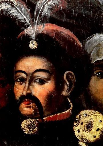Keywords: Ikona Pokrova. Chmelnicki.jpg Ікона Пок ова з зоб аженням гетьмана Богдана Хмельницького Деталь Де ево темпе а ізьба Кінець 17 початок 18 ст 110х77 см Д УО Bohdan Khmelnytsky portrait icon detail http //www zsu zp ua/euk/img/Xm_B5 jpg 17th-18th c author PD-old Bohdan Khmelnytsky Cossack hats