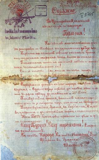 | Keywords: Ilinden-Preobrazhenie-proclamation.jpg П окламация на Вто и Битолски еволюционен ок ъг на В ОРО за начало на Илинденско-П еоб аженското въстание П авописът е запазен като в о игинала Ок Unicode ѫ жно До Цент овит селскит началници и на ода Б атя айс тн многоочаквания день за асп ава съ в ковния ни душманинъ дойде вече Къ въта на нашит невинно загинали б атя отъ ту ската ти ания вика високо за отплата Погазената честь на нашит майки и сест и иска възтановяванието си Стига толкова м ѫ ки стига толкова позо ъ Хилядо п ѫ ти по-доб смъ ть отъ колкото този скотски животъ Оп д ления день въ който на ода изъ ц ла акедония и Од инско ще т бва да изл зе явно съ о ъжие в ѫ ка с щу душманина е 20-и Юлий 1903 година Посл двайте б атя вашит началници въ този ден и се събе ете подъ знамето на свободата Упо ствувайте б атя въ бо бата Само въ упо ита и дългот айна бо ба е спасението ни ека БОГЪ благослови п авото ни д ло и деня на въстанието ДОЛУ ТУРЦИЯ ДОЛУ ТИРА ИЯТА Смъ ть на душманит Да жив е АРОДА да жив е СВОБОДАТА У а Ц луваме ви б адски Щабътъ Proclamation of the Ilinden-Preobrazhenie uprising in The II Revolutionary district scanned 20 July 1903 2 August Document of Internal Macedonian-Adrianopopitan Revolutionary Organization PD-old IMARO 1903 documents 20 July Cyrillic writing Handwriting |