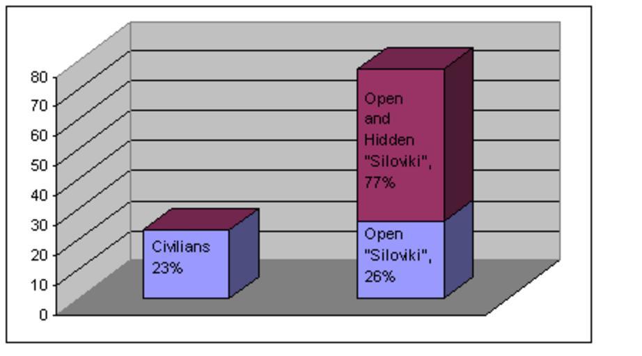 | Keywords: IllarionovBureaucratSilovikiPercentage.PNG Professional affiliations of the government workers in modern Russia according to en Andrey Illarionov own 2007-05-08 Alex Bakharev based on slide 7 from http //www iea ru/article/corp_country/12_04_07_1 ppt Illarionov presentations |