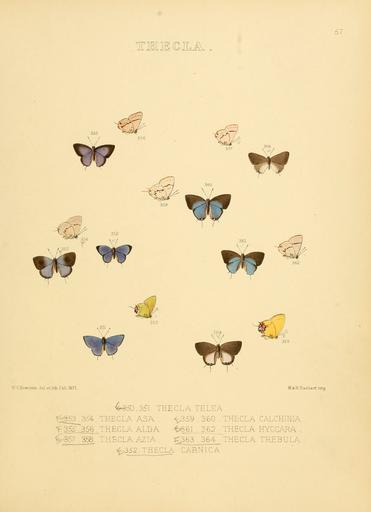 | Keywords: Illustrations Diurnal Lepidoptera 2 - Plate 57.png  en William Chapman Hewitson 1865 1862-1878 Illustrations of diurnal Lepidoptera Lycaenidae London John van Voorst Thecla Telea Plate LVII male figs 350 351 accepted name Chlorostrymon telea Hewitson 1868 In the Collection of W C Hewitson from the Amazon Thecla Carnica Hewitson Plate LVII male fig 352 accepted name Dicya carnica Hewitson 1873 In the Collection of H W Bates from the Amazon Thecla Alda male Plate LVII 6 figs 355 356 accepted name Aubergina alda Hewitson 1868 In the Collection of H W Bates from the Amazon Para Thecla Azia Plate LVII male figs 357 358 accepted name Ministrymon azia Hewitson 1873 In the Collection of W C Hewitson from Mexico Thecla Calchinia Plate LVII male figs 359 360 accepted name Nesiostrymon calchinia Hewitson 1868 In the Collection of H W Bates from the Amazon Ega Thecla Hyccara Plate LVII male figs 361 362 accepted name Nesiostrymon hyccara Hewitson 1868 In the Collection of W W Saunders from the Amazon Thecla Trebula Plate LVII male figs 363 364 accepted name Calycopis trebula Hewitson 1868 In the Collection of H W Bates from the Amazon Ega Illustrations of diurnal Lepidoptera Lycænidæ Vol 2 plate 57 1865 William Chapman Hewitson PD-old Illustrations of diurnal Lepidoptera - Hewitson Chlorostrymon telea Dicya carnica Aubergina alda Ministrymon azia Nesiostrymon calchinia Nesiostrymon hyccara Calycopis trebula |