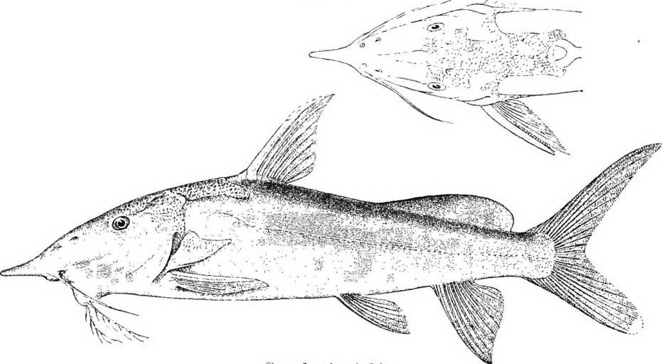 <em>Synodontis xipliias. Type. i. serrated on inner border. Ventral not reaching anal. Caudal deeply notched. Caudal peduncle as long as deep. Uniform brownish. Total length 580 millim. Niger. 1. Type, stuffed. Niger. Mr. J. T. Dalton (C). 42. SYNODONTIS GRESHOFFI. Schilthnis, Tijdschr. Nederl. Dierk. Ver. (2) iii. 1891, p. 87 ; Bouleng. Poiss. Bass. Congo, p. 316 (1901). Synodontis afro-fischeri (non Hilgend.), Vaill. N. Arch. Mus. (3) viii. 1896, p. 152, pi. xiv. fig. 2. Depth of body equal to or a little greater than length of head, 3 to</em>