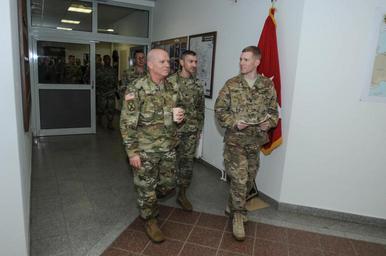 Keywords: 4id mce baumholder rheinland-pfalz rheinlandpfalz germany de Lt. Gen. Kenneth R. Dahl (left), the commanding general of U.S. Army Installation Management Command, talks with 4th Infantry Division, Mission Command Element battle captain, 1st Lt. Robert Hall, before going into the Joint Operation Center in the 4th Infantry Division MCE headquarters at Baumholder, Germany, Jan. 13, 2016. Dahl took a tour of the facilities and was given an operational brief about the unit’s mission in support of Atlantic Resolve. (Photo by Sgt. 1st Class Jason Epperson, MCE PAO, VIRIN: 160113-A-RK974-512) Lt. Gen. Kenneth R. Dahl (left), the commanding general of U.S. Army Installation Management Command, talks with 4th Infantry Division, Mission Command Element battle captain, 1st Lt. Robert Hall, before going into the Joint Operation Center in the 4th Infantry Division MCE headquarters at Baumholder, Germany, Jan. 13, 2016. Dahl took a tour of the facilities and was given an operational brief about the unit’s mission in support of Atlantic Resolve. (Photo by Sgt. 1st Class Jason Epperson, MCE PAO, VIRIN: 160113-A-RK974-512) |