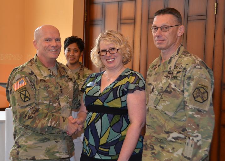 Keywords: people indoor Lt. Gen. Kenneth R. Dahl, IMCOM commander, recognizes Tawny Jimeno, Family, Morale, Welfare and Recreation, for superior performance. (Photo by Ignacio "Iggy"Rubalcava, USAG Rheinland-Pfalz PAO) Lt. Gen. Kenneth R. Dahl, IMCOM commander, recognizes Tawny Jimeno, Family, Morale, Welfare and Recreation, for superior performance. (Photo by Ignacio "Iggy"Rubalcava, USAG Rheinland-Pfalz PAO) |