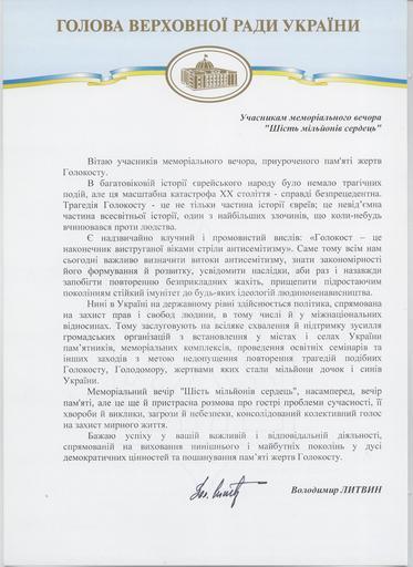 | Keywords: Заявление о памяти Холокоста от Владимира Литвина главы Верховной Рады Украины.jpg ru Заявление о памяти Холокоста от Владими а Литвина главы Ве ховной Рады Ук аины Ukrainian Goverment Vladimir Letvin PD-Ukraine The Holocaust in Ukraine Volodymyr Lytvyn |