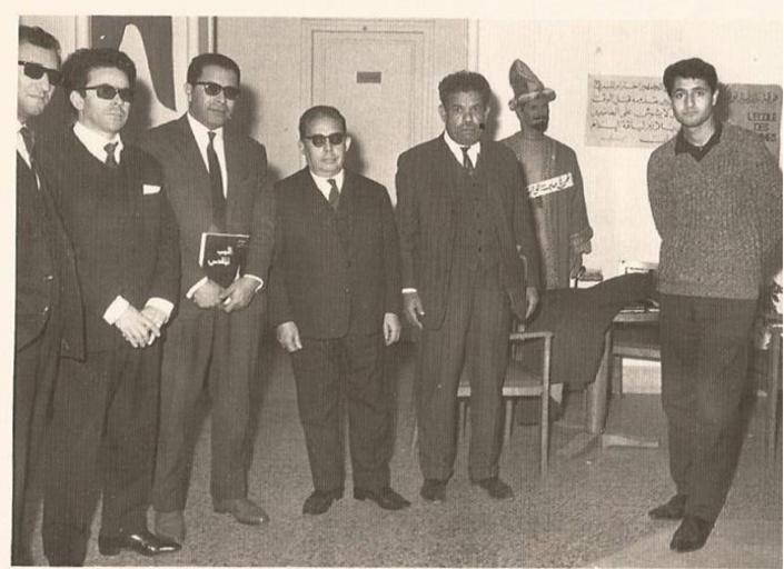 Keywords: مفدي زكريا ثم محمد الصالح المهيدي.jpg ar صورة أخذت على ما يبدو في أسبوع المسرح ويظهر فيها من اليسار محمد السقانجي وعبد المجيد التلاتلي وأحمد اللغماني حاملا ديوان اللهيب المقدس للواقف حذوه مفدي زكريا ثم محمد الصالح المهيدي وأخيرا شخص لم نتمكن من العثور على اسمه 1945 facebook author other versions Custom license marker 2015 06 10 PD-Tunisia Uploaded with UploadWizard Poets from Tunisia Moufdi Zakaria |