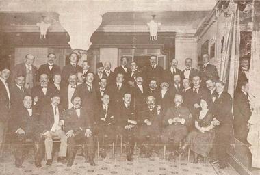 Keywords: الاجتماع الذي عُقد بدعوة من كارنتيي.jpg ar رجال الصحافة التقطت هذه الصورة في نزل الماجستيك بشارع باريس عشية يوم الخميس 22 أفريل 1922 إثر الاجتماع الذي عُقد بدعوة من كارنتيي Édmond Lecore-Carpentier مدير ومؤسّس جريدة الدبيش La Dépêche tunisienne الذي تقرّر فيه استئناف النشاط النقابي بعد ارتفاع الحجر عن الصحافة، وقد حضره أعلام الإعلام من التونسيين المطربشون المرحومون يمينا وقوفا محمد الجعايبي صاحب جريدة الصواب وعزوز الخياري صاحب جريدة ترويح النفوس والطيب بن عيسى صاحب جريدة المشير وجلوسا في الصف الأوّل محمّد الشاذلي المورالي صاحب جريدة المنير 1923 facebook author other versions Custom license marker 2015 06 17 PD-Tunisia Uploaded with UploadWizard Journalists from Tunisia |