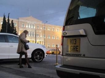 Keywords: Former King Contastine's Land Rover Discovery parked outside the luxurious hotel "Grande Bretagne" in Syntagma Square, Athens, where he has been staying the last few days, with the Greek Parliament in the background, half an hour after yet another peaceful demonstration... |