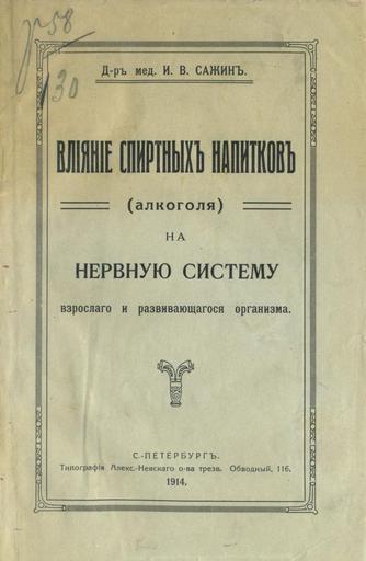 | View Original: | Сажин И.В. Влияние спиртных напитков (алкоголя) на нервную систему взрослого и развивающегося организма. (1914) — Титульный лист.jpg (653x1000) | |||