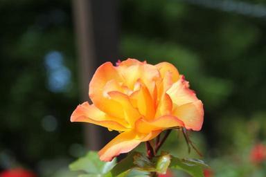 Keywords: plant flower outdoor depth of field Rose 'Tequila Sunrise' Red blend Hybrid Tea. Registration name: DICobey Exhibition name: Tequila Sunrise Bred by Patrick Dickson (United Kingdom, 1988). Florists Rose, Hybrid Tea. Yellow and red, red edges. Mild fragrance. 40 petals. Medium, full (26-40 petals), cupped bloom form. Blooms in flushes throughout the season. Height of 30" to 32" (75 to 80 cm). Width of up to 2' (up to 60 cm). Rose 'Tequila Sunrise' Red blend Hybrid Tea. Registration name: DICobey Exhibition name: Tequila Sunrise Bred by Patrick Dickson (United Kingdom, 1988). Florists Rose, Hybrid Tea. Yellow and red, red edges. Mild fragrance. 40 petals. Medium, full (26-40 petals), cupped bloom form. Blooms in flushes throughout the season. Height of 30" to 32" (75 to 80 cm). Width of up to 2' (up to 60 cm).