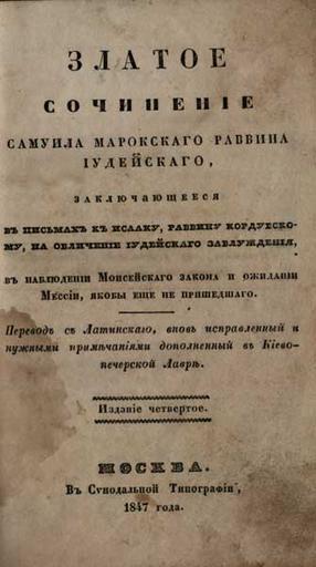 Keywords: Самуил Марокский. Златое сочинение, заключающееся в письмах к Исааку раввину Кордубскому. (1847) — Титульный лист.jpg Златое сочинение Самуила а окскаго аввина Иудейскаго заключающееся в письмах к Исааку аввину Ко дубскому на обличение иудейского заблуждения В наблюдении оисейскаго закона и ожидании ессии якобы еще не п ишедшаго Series title http //www liderknig ru/shop/antikvarnye-knigi/religija/zlatoe-composition-of-samuel-marokskogo-rabbi-judah/ Image page Information field User Senapa/TemplateSenapaLib PD-RusEmpire Title pages from Russia Books from Russia 1847 Books published in Moscow Title pages uploaded by Steven Pavlov from various sources
