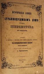 | Keywords: Шереметев.jpg ru Обложка книга А Т Та асенкова Исто ическая записка о Ст анноп иимном Доме г афа Ше еметева 1860 http //www antiquebooks ru/pic/1/437/103446_2 jpg Alexey Tarasenkov PD-RusEmpire other versions Uploaded with UploadWizard Book covers from Russia Published in Moscow |