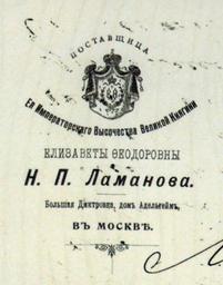 | Keywords: Знак поставщицы Великой Княгини Елизаветы Фёдоровны. Н.П.Ламанова.jpg ru Поставщица Ея Импе ато скаго Высочества Великой Княгини Елизаветы Фёдо овны П Ламанова Большая Дмит овка Домъ Адельгеймъ Въ осквъ 2015-11-29 06 42 55 own F aristocrat other versions PD-RusEmpire Uploaded with UploadWizard Documents of the Russian Empire |