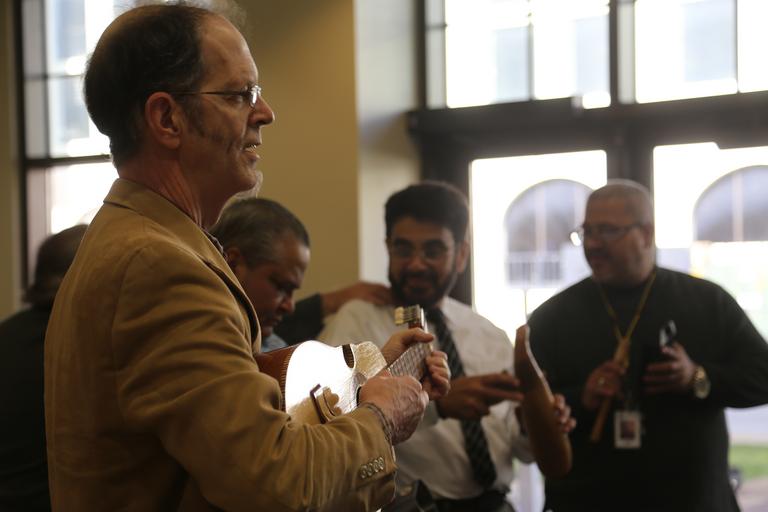 Keywords: IMCOM employees take a brief lunch break to participate and learn about the Caribbean Christmas Tradition called "Parranda."