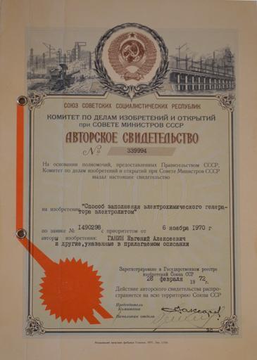 Keywords: Авторское свидетельство на изобретение Е. А. Ганина. Выдано ГКСМ СССР по делам изобретений и открытий. 8.02.1977г. 02.jpg ru Авто ское свидетельство 339994 на изоб етение Е А Ганина Способ заполнения элект охимического гене ато а элект олитом Выдано Госуда ственным Комитетом Совета инист ов СССР по делам изоб етений и отк ытий За егист и овано в Госуда ственном еест е изоб етений СССР 28 02 1972г Из а хива Е А Ганина 2015-01-29 13 33 21 Е А Ганин Yanov1991 other versions Авто ские свидетельства на изоб етения в СССР cc-zero Uploaded with UploadWizard Documents of the Soviet Union