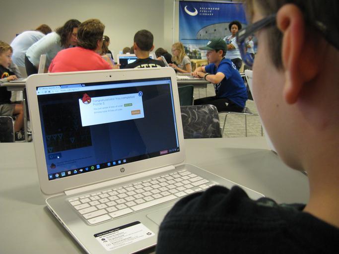 | Keywords: kalamazoo kalamazoo public library kalamazoopubliclibrary code computer skills indoor electronics monitor display screen portable computer laptop screen computer screen KPL Code Camp: Kids and parents work together to solve problems and learn basic computer coding skills, then craft a "binary bracelet" to wear and take home. www.kpl,.gov KPL Code Camp: Kids and parents work together to solve problems and learn basic computer coding skills, then craft a "binary bracelet" to wear and take home. www.kpl,.gov |