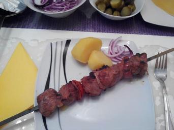 Keywords: Шашлык из свинины с картошкой и луком.jpg ru Шашлык из свинины ма инад на кетчупе с ка тошкой и к асным луком de Schaschlik aus Schweinefleisch in Ketchup mariniert als Beilage Kartoffeln und rote Zwiebeln en Pork shashlik marinated in ketchup with potatoes and red onion own Spacekid 2015-11-07 Shashlik Meals in Russia Plates with food Red onions Potatoes Cc-zero |