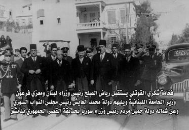 View Original: | الرئيس شكري القوتلي مستقبلاً دولة الرئيس رياض الصلح في دمشق عام 1948.jpg (720x494) | |||