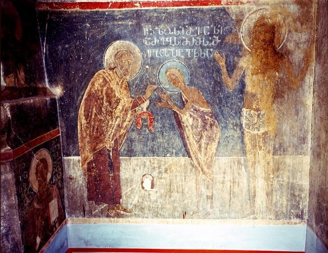 Keywords: მარიამ ეგვიპტელის ზიარება.jpg The mural in Betania Monastery Georgia The mural is called მარიამ ეგვიპტელის ზიარება jpg The official disk of Betania monastery XII-XIII centuries Created by order of Queen Tamar of Georgia PD-Art Betania western wall murals Asomtavruli frescos |