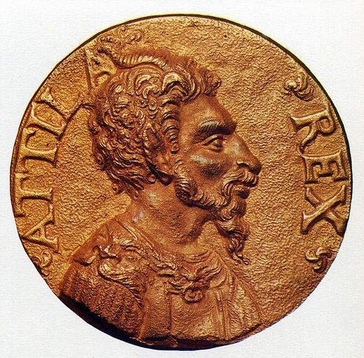 Keywords: Аттила (медаль).jpg Аттила медаль Из соб ания импе ато а Рудольфа II Скан иллюст ации из книги Otto Zierer Herbert Reinoß Die großen Ereignisse der Weltgeschichte Gütersloch Bertelsmann Reinhard Mohn OHG Buch-Nr 5753 3300 е позже начала XVII в author PD-Art Images of user Vitold Muratov - Nuremberg Attila the Hun