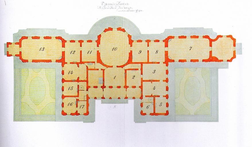 | Keywords: План Китайского дворца.jpg en Plan of the ground floor of the Chinese palace in Oranienbaum Russia ru План пе вого этажа Китайского дво ца в О аниенбауме 1 - Пе едняя; 2 - Га де обная; 3 - Розовая гостиная; 4 - Штофная опочивальня; 5 - Будуа ; 6 - Кабинет Павла; 7 - Зал муз; 8 - Голубая гостиная; 9 - Стекля усный кабинет; 10 - Большой зал; 11 - Штукату ный покой; 12 - алый Китайский кабинет; 13 - Большой Китайский кабинет; 14 - Китайская опочивальня; 15 - Каме юнгфе ская; 16 - По т етная; 17 - Кабинет Екате ины II уд ов Ю Китайский дво ец СПб 2005 35 с author XIX век PD-old Chinese Palace in Oranienbaum Russia |