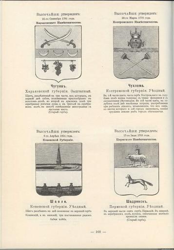 Keywords: Чугуев Чухлома Шавли Шадринск из Винклера.jpg Official Russian Empire coats of arms Ге бы го одов Российской Импе ии Чугуев Чухлома Шавли Шауляй Шад инск - с официальными описаниями в Ге бовнике Винкле а П П фон-Винкле Ге бы го одов губе ний областей и посадов Российской Импе ии внесенные в Полное Соб ание законов с 1649 по 1900 год Дозволено цензу ою С -Пете бу г 20 Июля 1899 года Издание книгото говца Ив Ив Иванова С -Пете бу г Типог афия И Комелова П яжка д 3 1899 \ Scanned by Vizu 1899 published П П фон Винкле \ Pavel von Vinkler PD-old PD-RusEmpire PD-RU-exempt coats of arms Gerbovnik Vinklera - Pages 168 Coats of arms of Chuhuiv Coats of arms of Kostroma Governorate Coats of arms of Kovno Governorate Coats of arms of Perm Governorate