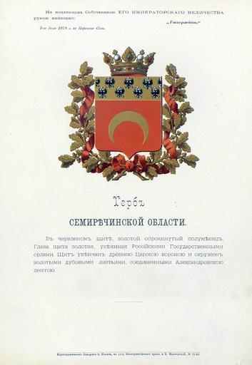 Keywords: Семиреченская область из Бенке.jpg Official Russian Empire coat of arms Semirechensk Oblast Полугласный ге б Российской Импе ии Семи еченской области с официальным описанием в Ге бовнике Бенке Утве ждён Импе ато ом Все оссийским Александ ом Вто ым в 1878 году Ге бы губе ний и областей Российской Импе ии Отпечатано по аспо яжению минист а внут енних дел Санкт-Пете бу г Ка тог афическое заведение А А Ильина и типог афия инисте ства путей сообщения А Бенке 1880 / Scanned on paper album 1878 / 1880 published Russian Empire PD-old PD-RusEmpire PD-RU-exempt <gallery> File Семи еченская область ВД Бенке jpg File Семи еченская область изд Сукачова JPG File Семи еченская обл 1878 из Винкле а jpg File Coat of Arms of Semirechye Province png </gallery> Semirechensk Oblast Gerbovnik Benke Russian canting arms 1 crescent Or in heraldry Eagles in heraldry Semy shields