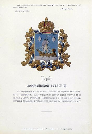 | Keywords: Ломжинская губерния из Бенке.jpg Official Russian Empire coat of arms Lomzha Governorate Ге б Российской Импе ии Ломжинской губе нии с официальным описанием в Ге бовнике Бенке Утве ждён Импе ато ом Все оссийским Александ ом Вто ым Ге бы губе ний и областей Российской Импе ии Отпечатано по аспо яжению минист а внут енних дел Санкт-Пете бу г Ка тог афическое заведение А А Ильина и типог афия инисте ства путей сообщения А Бенке 1880 / Scanned on paper album 1869 / 1880 published Russian Empire PD-old-100 PD-RusEmpire PD-RU-exempt coats of arms <gallery> File Ломжинская губ ВД Бенке jpg File Ломжинская губе ния изд Сукачова JPG File Coat of Arms of Łomża gubernia Russian empire png </gallery> Coats of arms of Lomzha Governorate Gerbovnik Benke Sailboats in heraldry 2 lozenges in heraldry |