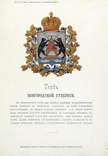 | Keywords: Новгородская губерния из Бенке.jpg Official Russian Empire coat of arms Novgorog Governorate Ге б Российской Импе ии овго одской губе нии с официальным описанием в Ге бовнике Бенке Утве ждён Импе ато ом Все оссийским Александ ом Вто ым в 1878 году Ге бы губе ний и областей Российской Импе ии Отпечатано по аспо яжению минист а внут енних дел Санкт-Пете бу г Ка тог афическое заведение А А Ильина и типог афия инисте ства путей сообщения А Бенке 1880 / Scanned on paper album 1856 / 1880 published Russian Empire PD-old PD-RusEmpire PD-RU-exempt coats of arms <gallery> File овго одская губ ВД Бенке jpg File овго одская губе ния изд Сукачова jpg File Coat of Arms of Novgorod gubernia Russian empire png </gallery> Coats of arms of Novgorod Governorate Gerbovnik Benke Bears in heraldry Crosses in heraldry |