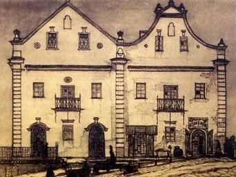 Keywords: Г. Лукомський. Близнюки в Кременці.jpg uk Близнюки в К еменці від чолового фасаду Рисунок Г Лукомського а хів Гео гій Лукомський поч 20 ст PD-Art The dwelling house Twins in Kremenets Historical images of Kremenets Georgy Lukomsky