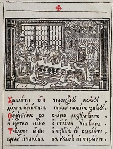 Keywords: Урок в школе.jpg ru У ок в школе Г авю а из «Буква я славенскими г еческими имскими писмены» Ф П Полика пова-О лова http //www pravenc ru/text/153351 html op unknown circa 1700 PD-Art Grammar 17th-century books