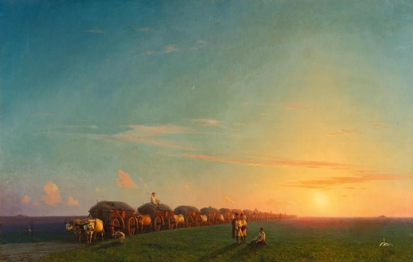 Keywords: Иван Константинович Айвазовский - Широкий пейзаж с поселенцами.jpg Artwork Creator Ivan Aivazovsky Weite Landschaft mit Siedlern Broad landscape with settlers Dargestellt ist die Isumskaja-Steppe nahe der heutigen Grenze zwischen Russland und der Ukraine durch welche Salzbauern auf ihrem Weg von der Krim ins Innere Russlands ziehen Shown is the Izumskaya-steppe near the present-day border between Russia and Ukraine through which salt farmers move on their way from the Crimea to the interior of Russia Исумская степь в айоне нынешней г аницы между Россией и Ук аиной че ез кото ую к естьяне везут соль из К ыма в глубь России 1856 oil canvas cm 93 145 object history Provenance private collection Europe credit line LangSwitch Unten links signiert Айвазовского 1856 Signed lower left in Cyrillic Aivazovski 1856 Подпись внизу слева Айвазовского 1856 accession number http //www kollerauktionen ch/de/asp/fullCatalogue asp salelot A162++++3212+ refno ++464977 saletype Galerie Koller PD-old-100 Paintings of Ivan Aivazovsky in 1850s 1856 oil on canvas paintings Historical scenes by Ivan Aivazovsky Landscapes by Ivan Aivazovsky 1850s landscape paintings Landscape paintings from Russia Steppes in Russia 1856 Steppes in Ukraine 1856 1856 in Russia Ukraine in the 1850s Images from Koller Auktionen