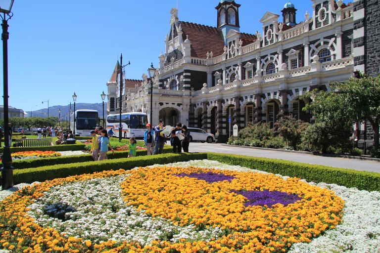 Keywords: Dunedin Railway Station in Dunedin on New Zealand's South Island, designed by George Troup, is the city's fourth station. It earned its architect the nickname of "Gingerbread George". Dunedin was linked to Christchurch by rail in 1878, with a link south to Invercargill completed the following year, and the first railway workshops were opened at Hillside in South Dunedin in 1875. Early plans were for a grand main station on Cumberland Street, but these did not get further than the laying of a foundation,[1] and a simple temporary weatherboard station was built next to the site in 1884. It took close to 20 years for government funding to be allocated, and planning only really commenced as the 19th century was drawing to a close. The logistics of constructing what was at the time New Zealand's busiest railway station took three years before construction began in 1903.[2] Dunedin required a station for a wide range of activities: it was a commercial and industrial centre, close to gold and coalfields, with a hinterland that was dependent on livestock and forestry for its economy. en.wikipedia.org/wiki/Dunedin_Railway_Station |