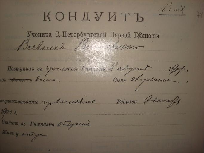 | Keywords: Титульный лист кондуита Всеволода Вишневского.jpg ru Титульный лист кондуита Всеволода Вишневского составленного в 1-ой Санкт-Пете бу гской гимназии в пе иод 1909 1912 гг 1909 1912 School's Museum collection 321 School St Petersburg The address of museum 191119 Russia Saint-Petersburg Socialisticheskaya St 7 / Pravdy St 11 phone +7 812 764-86-38 e-mail sch321 center-edu/spb/ru The First Saint-Petersburg Gymnasium now School 321 St Petersburg Russia PD-1923 PD-old-70-1923 Uploaded with UploadWizard School certificates The First Saint-Petersburg Gymnasium St Petersburg Russia Vsevolod Vishnevsky |
