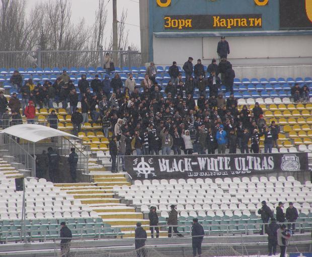 Keywords: Сектор ультрас Зорі Луганськ.jpg de Sektor der Sorja-Ultras im Awanhard-Stadion Luhansk uk Секто ульт ас Зо і Луганськ на стадіоні Аванга д own PavloFriend 2010-03-06 Avanhard Stadium Luhansk Association football supporters of Ukraine Ultras 2010 in Luhansk