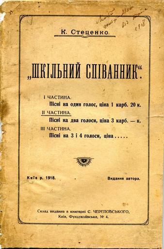 | Keywords: К. Стеценко. «Шкільний співанник».jpg uk К Стеценко «Шкільний співанник» ІІ частина Пісні на два голоса Київ Видання авто а 1918 З да чим написом донці асті ЦДА Л Ук аїни ф 175 оп 1 од зб 21 а к 1 1 зв 2014-09-30 20 44 29 http //csam archives gov ua author other versions PD-Art Kyrylo Stetsenko Uploaded with UploadWizard |