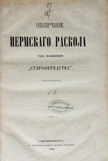Keywords: Палладий (Пьянков). Обозрение пермского раскола, так называемого «старообрядства». (1863) — Тит. лист.jpg http //www antiquebooks ru/book php book 104576 Image page 200px Information field User Senapa/TemplateSenapaLib PD-old-auto-1923 1882 Title pages from Russia Books from Russia 1863 Books published in Saint Petersburg Title pages uploaded by Steven Pavlov from various sources