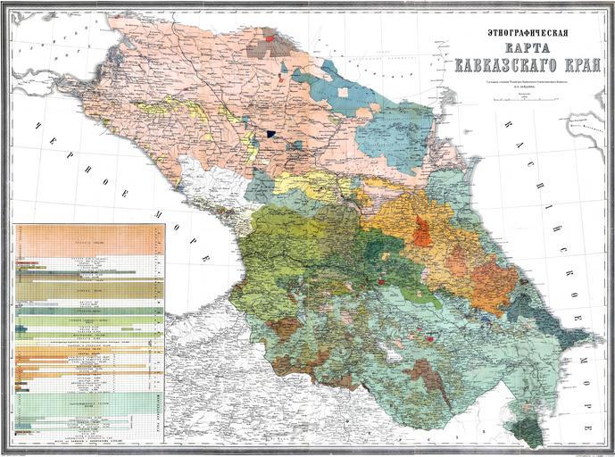 Keywords: Этнографическая карта Кавказского края (1880 г.)..jpg ru Этног афическая ка та Кавказского к ая 1880 г асштаб 1 1080000 de Ethnographische Karte von Kaukasien im jahre 1880 Maßstab 1 1080000 1880 Издан ка тог афическом заведением Алексе́я Афиноге́новича Ильи́на <small> п имечание Г ави овал ка ту А Ю генс В левом нижнем углу ка ты показана таблица с на одностями населяющими Кубань и Кавказ </small> в Санкт-Пете бу ге а потом пе епечатан на немецком языке в п естижном жу нале «Геог афические записки Пете манна» «Petermanns Geographische Mitteilungen https //archive org/stream/bub_gb_7pY3XpxYNssC page/n396/mode/1up 26 Band im jahre 1880 seiten 364» Данные о население Кавказского К ая являются официальными и относятся в основном к каме альным описаниям 1873-1876 гг Каме альные описание п оводились в Став опольской Кутаисской Тифлисской Э иванской Елизаветпольской Бакинской губе ниях и Закатальском ок уге 1873-ем году; в Те ской области Че номо ском ок уге и Сухумском отдьле 1874-ом году; в Дагестанской области 1873-1875 гг ; в Кубанской области 1876-ом году <br/><small>П имичание <br/> Ка сская область уч еждена 1 нояб я 1877 г п иказ по Кавказской а мии и Кавказскому военному ок угу от 1 нояб я 1877 г за 409 а Батумская область 1878 г Указом Александ а II оба на те ито ии отошедшей от Османской импе ии завоеванные Батумский санджак Т абзонского вилайета >> пе еделано в Батумскую область Ка сский и Чалды ский санджаки Э зу умского вилайета >> объединено и пе еделано в Ка сскую область к России по езультатам усско-ту ецкой войны 1877 1878 гг согласно Бе линскому т актату </small> Original from http //www etomesto ru/karta1095/ www etomesto ru Ка ту составил главный едакто и цензо Кавказского статистического комитета иколай Ка лович Зейдлиц PD-RusEmpire other versions <gallery> File Этног афическая ка та Ка сской области 1880 г jpg File Этног афическая ка та Сигнахского уезда 1880 г jpg File Этног афическая ка та Ленко анского уезда 1880 г jpg </gallery> PD-Art-100 Uploaded with UploadWizard Maps of the history of the Caucasus under Russian rule Maps of the history of Nakhichevan Maps of Azerbaijani-inhabited regions Azerbaijani-inhabited regions Maps of the history of Karachay-Cherkessia Maps of the history of Kabardino-Balkaria Maps of the history of Kalmykia Maps of the history of Dagestan Maps of the history of Chechnya Maps of the history of Ingushetia Maps of the history of Adygea Maps of the history of Georgia Maps of the history of Ajaria Maps of the history of South Ossetia Maps of the history of North Ossetia-Alania Maps of the history of Abkhazia 19th-century maps of Azerbaijan 19th-century maps of Georgia Old maps of Elisabethpol Governorate Old maps of Baku Governorate Kars Oblast Old maps of Viceroyalty of the Caucasus 1880 maps of Russia