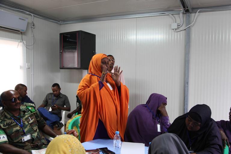 Keywords: indoor room AMISOM Gender Unit headed by AMISOM Women and Child Protection Officer Kaoutar Kaddouri and AMISOM Human Rights and Gender unit officer Rasha Elamin visited Baidoa today. The team met with Human Rights groups, women group representatives, AMISOM CIMIC officer, representatives from the local administration and discussed with them the needs and priorities of women and child protection, human rights issues, protection of the unprivileged members of the society, protection from rape and reportage of rape cases among others. AMISOM Photo AMISOM Gender Unit headed by AMISOM Women and Child Protection Officer Kaoutar Kaddouri and AMISOM Human Rights and Gender unit officer Rasha Elamin visited Baidoa today. The team met with Human Rights groups, women group representatives, AMISOM CIMIC officer, representatives from the local administration and discussed with them the needs and priorities of women and child protection, human rights issues, protection of the unprivileged members of the society, protection from rape and reportage of rape cases among others. AMISOM Photo