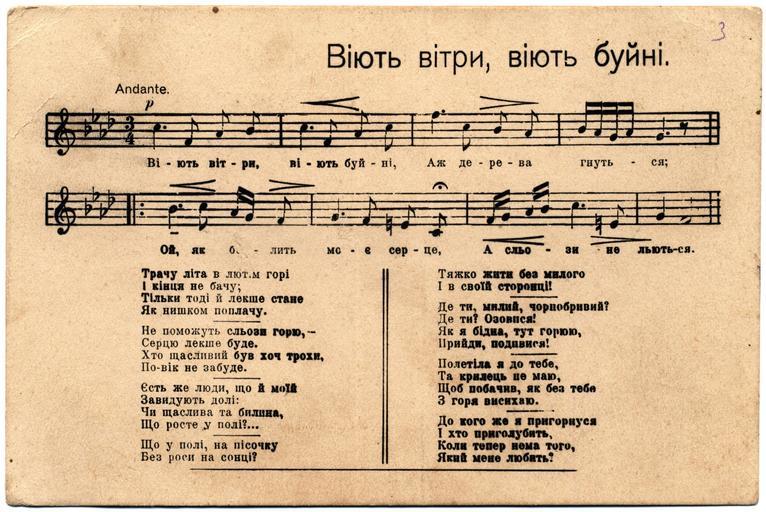 | Keywords: Віють вітри, віють буйні (листівка-1).jpg en Postcard with lyrics and music of folk song uk Поштова листівка зі словами та музикою на одної пісні self-scanned Marusia Churai en а уся Чу ай а усі Чу ай uk 1917 Віють віт и віють буйні листівка-2 jpg 1910s postcards Ukrainian folk songs 20th-century postcards of Russia Marusia Churai PD-old-100 |