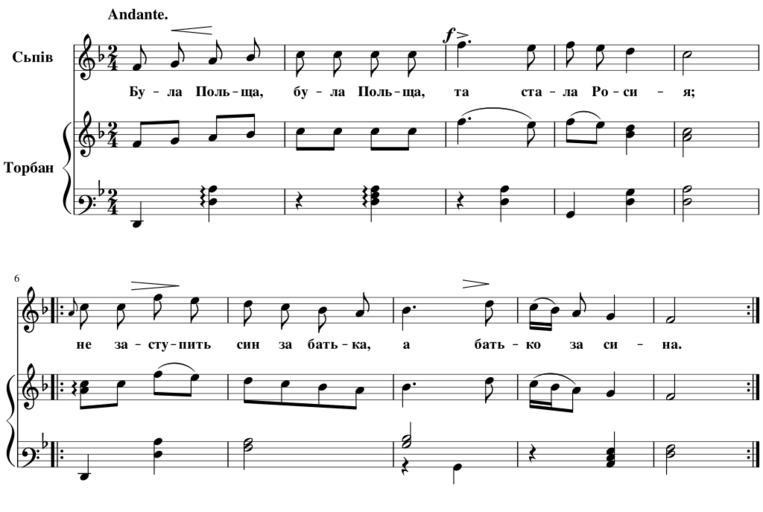 | Keywords: Була Польща та стала Росия.svg uk Ілюст ація до статті иколи Лисенка а одні музичні ст ументи на Вк аїнї оти на одної пісні Була Польща 1894-04-13 Зо я часопис 1894 07 с 161 а одна; Ф анц Відо т; икола Лисенко other versions Часопис Зо я 1894 07 pdf Hidden background ECECEC; white;color black border 1px grey solid; padding 2px Created by MuseScore <nowiki> < xml version 1 0 encoding UTF-8 > <museScore version 2 06 > <programVersion>2 0 2</programVersion> <programRevision>f51dc11</programRevision> <Score> <LayerTag id 0 tag default ></LayerTag> <currentLayer>0</currentLayer> <Synthesizer> </Synthesizer> <Division>480</Division> <Style> <TextStyle> <halign>center</halign> <valign>baseline</valign> <xoffset>0</xoffset> <yoffset>6</yoffset> <offsetType>spatium</offsetType> <name>Lyrics Odd Lines</name> <family>FreeSerif</family> <size>11</size> <bold>1</bold> <sizeIsSpatiumDependent>1</sizeIsSpatiumDependent> </TextStyle> <TextStyle> <halign>right</halign> <valign>center</valign> <offsetType>absolute</offsetType> <name>Instrument Name Long </name> <family>FreeSerif</family> <size>12</size> <bold>1</bold> <sizeIsSpatiumDependent>1</sizeIsSpatiumDependent> </TextStyle> <page-layout> <page-height>799 37</page-height> <page-width>1190 55</page-width> <page-margins type even > <left-margin>5 66929</left-margin> <right-margin>5 66929</right-margin> <top-margin>56 6929</top-margin> <bottom-margin>113 386</bottom-margin> </page-margins> <page-margins type odd > <left-margin>5 66929</left-margin> <right-margin>5 66929</right-margin> <top-margin>0</top-margin> <bottom-margin>0</bottom-margin> </page-margins> </page-layout> <Spatium>1 764</Spatium> </Style> <showInvisible>1</showInvisible> <showUnprintable>1</showUnprintable> <showFrames>1</showFrames> <showMargins>0</showMargins> <metaTag name arranger ></metaTag> <metaTag name composer > а одна</metaTag> <metaTag name copyright ></metaTag> <metaTag name creationDate >2015-11-25</metaTag> <metaTag name lyricist > а одна</metaTag> <metaTag name movementNumber ></metaTag> <metaTag name movementTitle ></metaTag> <metaTag name platform >Microsoft Windows</metaTag> <metaTag name poet ></metaTag> <metaTag name source ></metaTag> <metaTag name translator ></metaTag> <metaTag name workNumber ></metaTag> <metaTag name workTitle >Була Польща та стала Росия</metaTag> <PageList> <Page> <System> </System> <System> </System> </Page> </PageList> <Part> <Staff id 1 > <StaffType group pitched > <name>stdNormal</name> </StaffType> <bracket type -1 span 0 /> </Staff> <trackName>Voice</trackName> <Instrument> <longName>Сьпів</longName> <trackName>Voice</trackName> <minPitchP>36</minPitchP> <maxPitchP>94</maxPitchP> <minPitchA>40</minPitchA> <maxPitchA>79</maxPitchA> <instrumentId>voice vocals</instrumentId> <Articulation> <velocity>100</velocity> <gateTime>100</gateTime> </Articulation> <Articulation name staccatissimo > <velocity>100</velocity> <gateTime>33</gateTime> </Articulation> <Articulation name staccato > <velocity>100</velocity> <gateTime>50</gateTime> </Articulation> <Articulation name portato > <velocity>100</velocity> <gateTime>67</gateTime> </Articulation> <Articulation name tenuto > <velocity>100</velocity> <gateTime>100</gateTime> </Articulation> <Articulation name marcato > <velocity>120</velocity> <gateTime>67</gateTime> </Articulation> <Articulation name sforzato > <velocity>120</velocity> <gateTime>100</gateTime> </Articulation> <Channel> <program value 52 /> <synti>Fluid</synti> </Channel> </Instrument> </Part> <Part> <Staff id 2 > <StaffType group pitched > <name>stdNormal</name> </StaffType> <defaultClef>G8vb</defaultClef> <bracket type 1 span 2 /> </Staff> <Staff id 3 > <StaffType group pitched > <name>stdNormal</name> </StaffType> <defaultClef>G8vb</defaultClef> <bracket type -1 span 0 /> </Staff> <trackName>Acoustic Guitar</trackName> <Instrument> <longName>То бан</longName> <trackName>Acoustic Guitar</trackName> <minPitchP>40</minPitchP> <maxPitchP>83</maxPitchP> <minPitchA>40</minPitchA> <maxPitchA>83</maxPitchA> <instrumentId>pluck guitar acoustic</instrumentId> <clef>G8vb</clef> <StringData> <frets>19</frets> <string>40</string> <string>45</string> <string>50</string> <string>55</string> <string>59</string> <string>64</string> </StringData> <Articulation> <velocity>100</velocity> <gateTime>100</gateTime> </Articulation> <Articulation name staccatissimo > <velocity>100</velocity> <gateTime>33</gateTime> </Articulation> <Articulation name staccato > <velocity>100</velocity> <gateTime>50</gateTime> </Articulation> <Articulation name portato > <velocity>100</velocity> <gateTime>67</gateTime> </Articulation> <Articulation name tenuto > <velocity>100</velocity> <gateTime>100</gateTime> </Articulation> <Articulation name marcato > <velocity>120</velocity> <gateTime>67</gateTime> </Articulation> <Articulation name sforzato > <velocity>120</velocity> <gateTime>100</gateTime> </Articulation> <Channel> <program value 25 /> <synti>Fluid</synti> </Channel> </Instrument> </Part> <Staff id 1 > <Measure number 1 > <KeySig> <accidental>-1</accidental> </KeySig> <TimeSig> <sigN>2</sigN> <sigD>4</sigD> <showCourtesySig>1</showCourtesySig> </TimeSig> <Tempo> <tempo>1 16667</tempo> <text>Andante </text> </Tempo> <Chord> <durationType>eighth</durationType> <Lyrics> <syllabic>begin</syllabic> <text>Бу</text> </Lyrics> <Note> <pitch>65</pitch> <tpc>13</tpc> </Note> </Chord> <HairPin id 2 > <subtype>0</subtype> <Segment> <subtype>0</subtype> <off2 x -10 5 y 0 /> <pos x 26 2048 y -2 25 /> </Segment> </HairPin> <Chord> <BeamMode>no</BeamMode> <durationType>eighth</durationType> <Lyrics> <syllabic>end</syllabic> <text>ла</text> </Lyrics> <Note> <pitch>67</pitch> <tpc>15</tpc> </Note> </Chord> <Chord> <BeamMode>no</BeamMode> <durationType>eighth</durationType> <Lyr