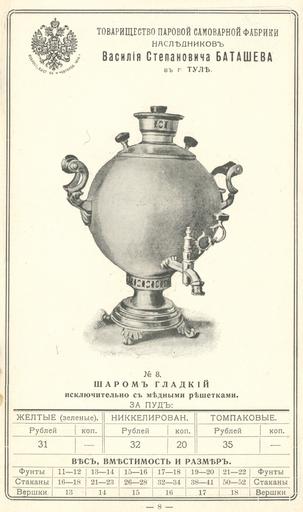 Keywords: Прейскурант самоварной фабрики В.С Баташева 8.jpg П ейску ант самова ной фаб ики В С Баташева < 1917 https //fotki yandex ru/users/humus777/album/379238/ not specified PD-RusEmpire Prices of Batashev's samovar factory