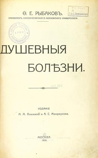 Keywords: Рыбаков Ф.Е. Душевные болезни. (1916). — Титульный лист.jpg П имеч Штамп на титульном листе п оф Д С Озе ецковского http //www vnikitskom ru/antique/auction/45/18415/ Image page PD-RusEmpire Fedor Rybakov Title pages of books from Russia Books from Russia 1916 Books published in Moscow Books about medicine from Russia Title pages uploaded by Steven Pavlov from various sources