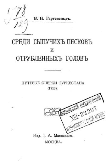 | Keywords: Среди сыпучих песков и отрубленных голов.jpg en This image is book cover from Russian language book С еди сыпучих песков и от убленных голов Путевые оче ки Ту кестана first time published in Moscow in 1913 by I A Maevskogo publishing house 1913 http //shkolazhizni ru/img/content/i62/62970_or jpg I A Maevskogo publishing house other versions Custom license marker 2016 08 27 PD-RusEmpire Wilhelm Harteveld Book covers from Russia | ||||