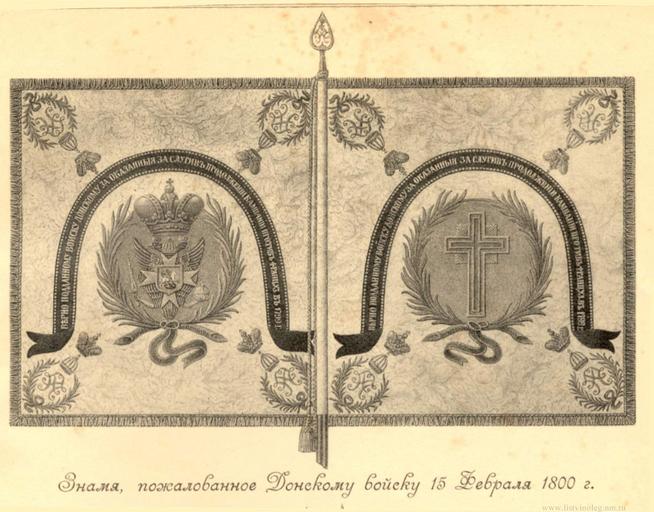 | Keywords: Знамя Войсковое Донского казачье 1800 года.jpg Flag of the Don Cossack Army 1800 Знамя Войсковое Донского казачье 1800 года 1800-02-15 http //forum fstanitsa ru/viewtopic php f 38 t 2048 Па́вел I Пет о́вич other versions insignia PD-RusEmpire Collection of Don Cossacks Regimental flags |